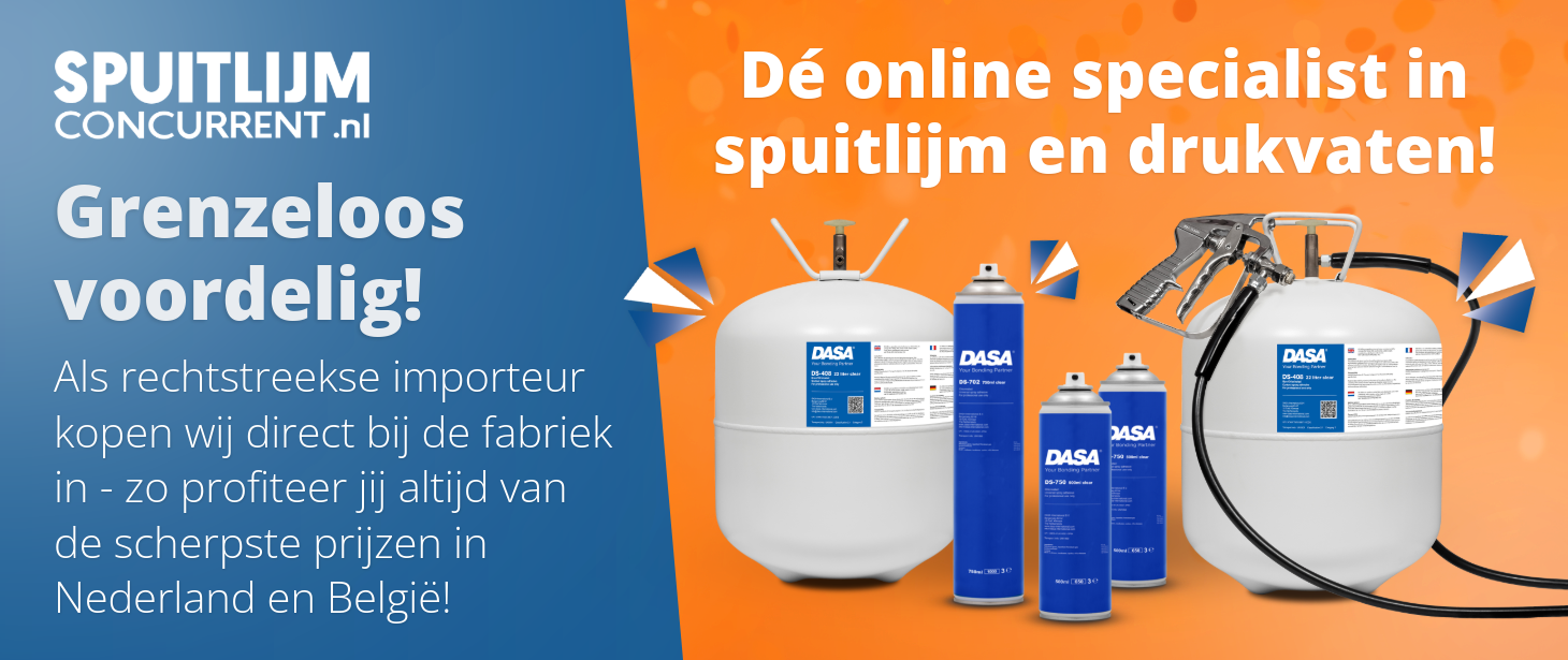 Dé online specialist in spuitlijm en drukvaten! Bij ons vind je alles voor jouw lijmproject: spuitlijm drukvaten, lijmspuitbussen, accessoires, contactlijm startpakketten en nog veel meer.